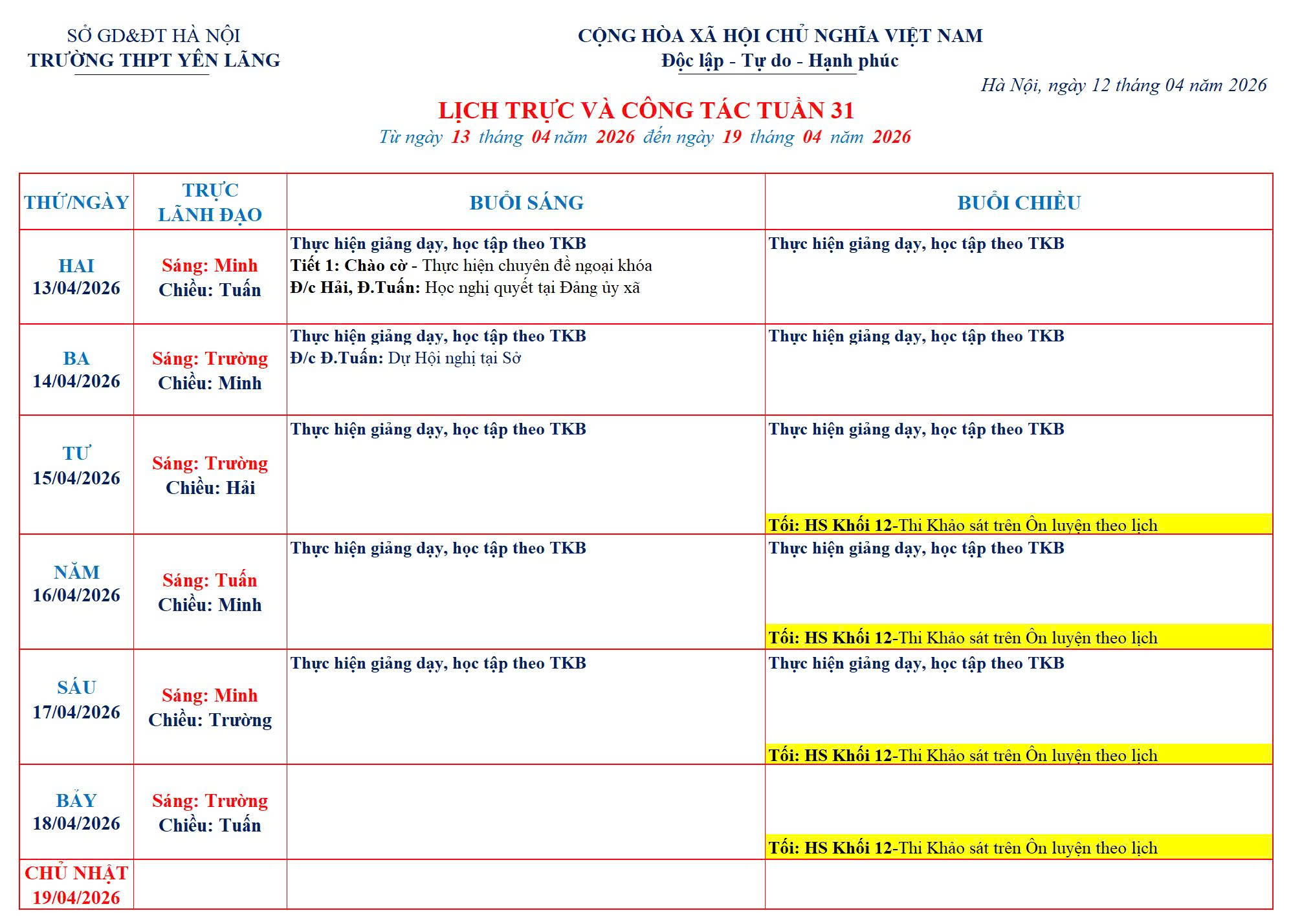 Lịch trực và công tác tuần 31 ( Từ ngày 13/4/2026 đến ngày 19/4/2026)