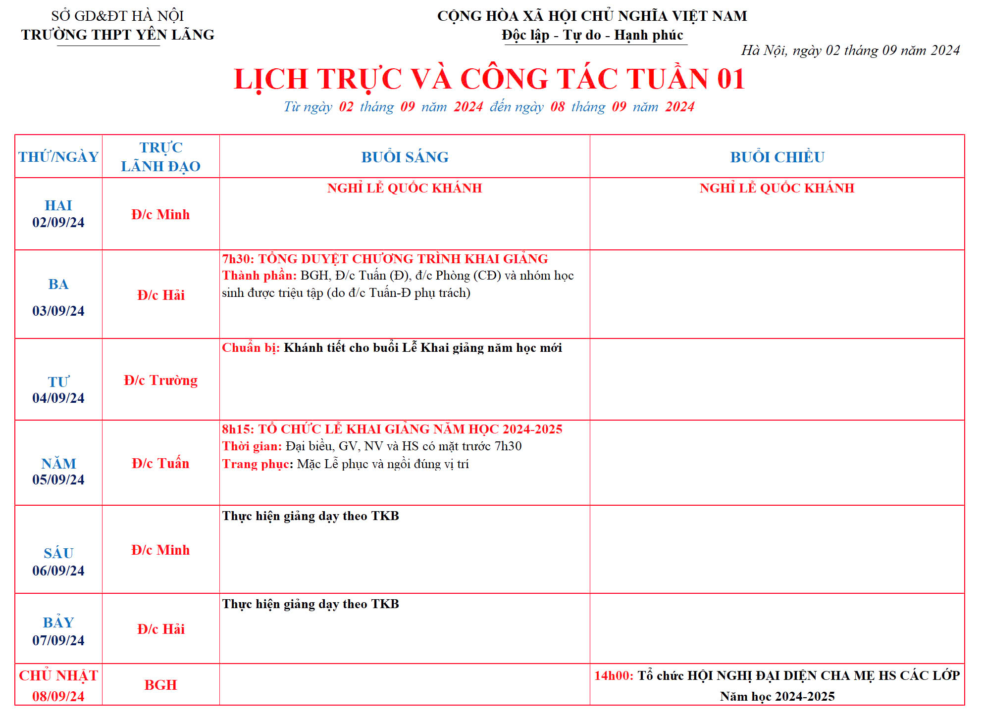 Lịch công tác tuần 1