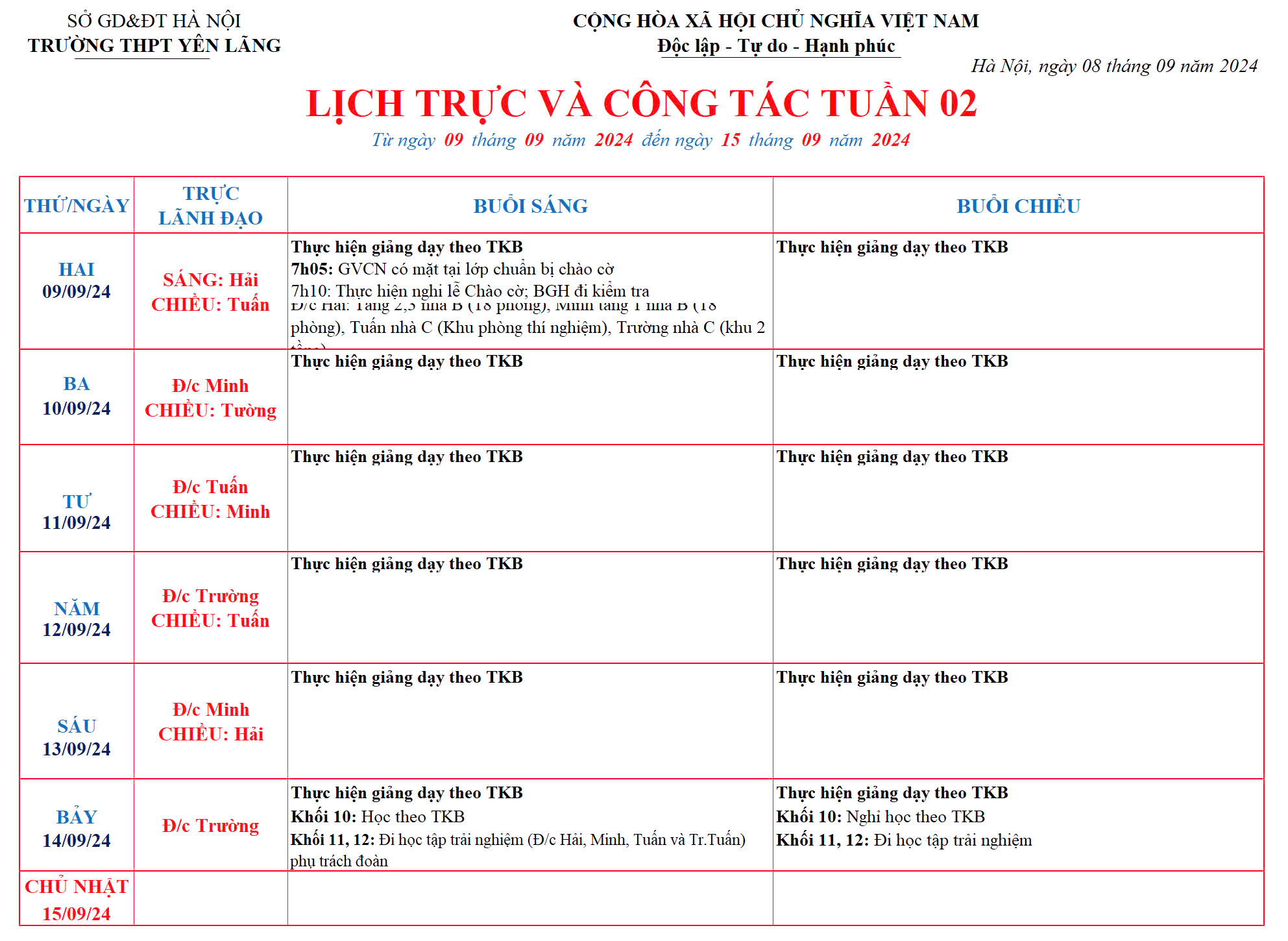 Lịch công tác tuần 2