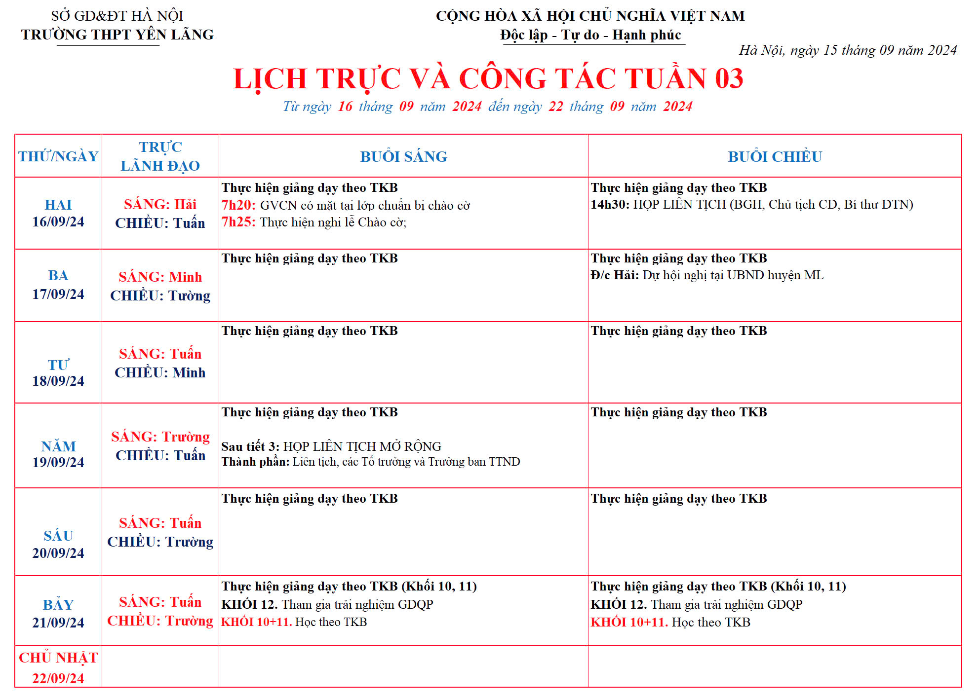 Lịch công tác tuần 03