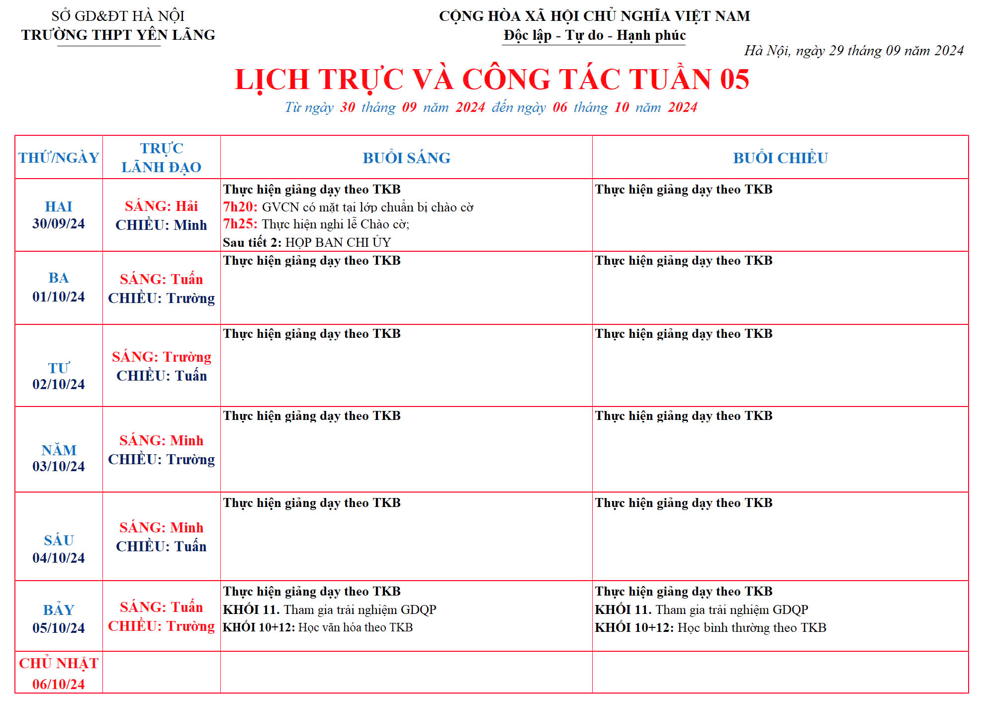 Lịch công tác tuần 05