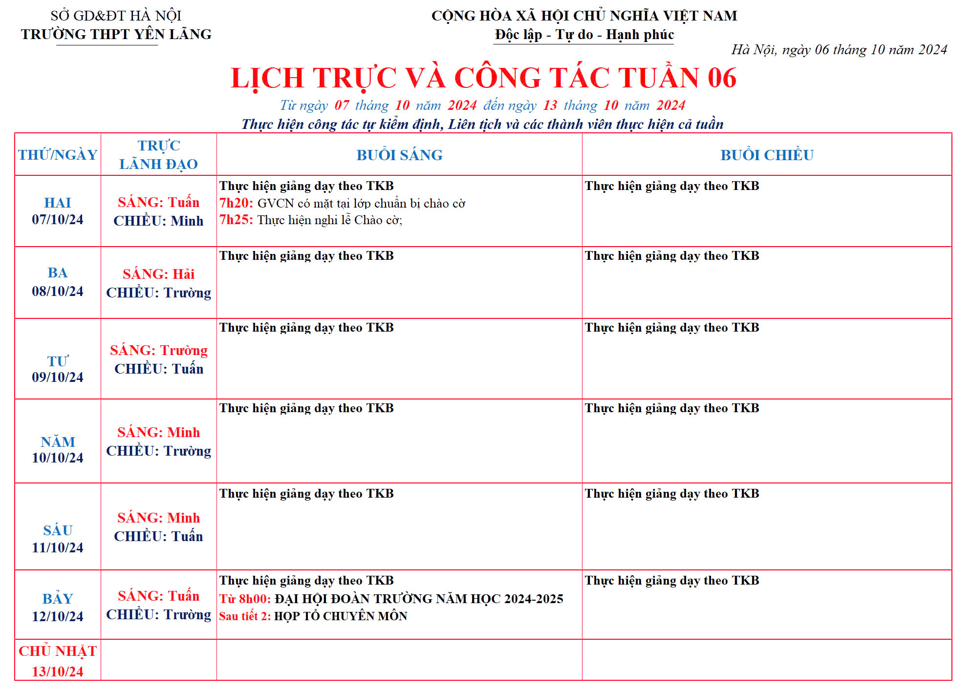 Lịch công tác tuần 06