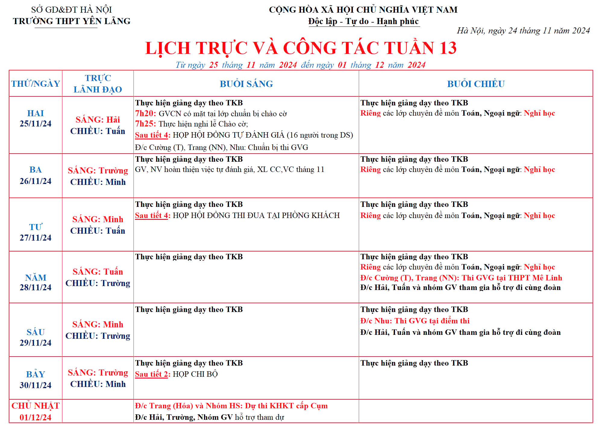 Lịch công tác tuần 13 (25/11/2024-01/12/2024)