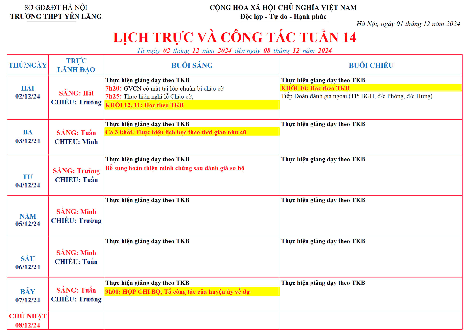 Lịch công tác tuần 14 (02/12/2024-08/12/2024)