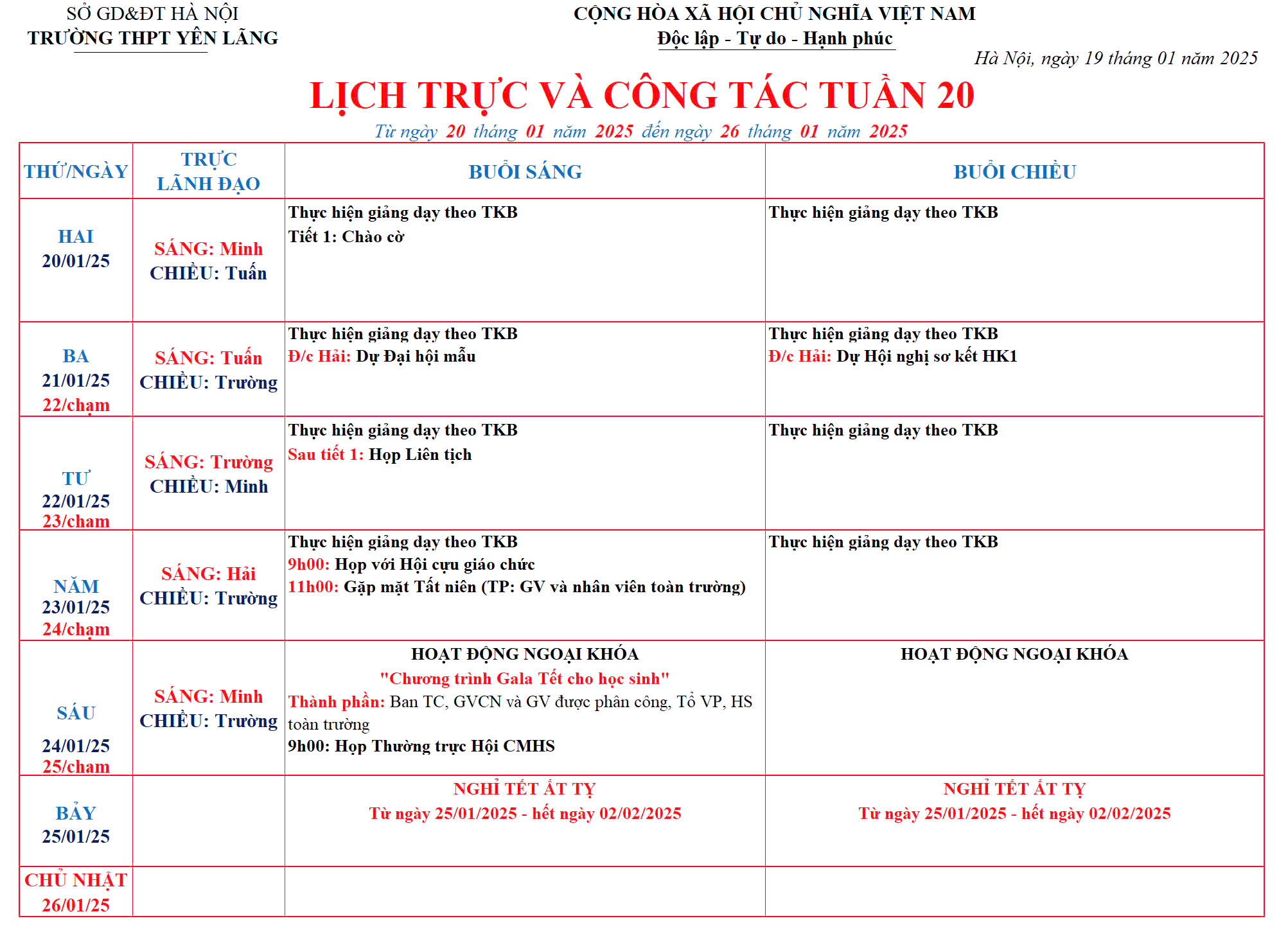 Lịch công tác tuần 20 (20/01/2025-26/01/2025)