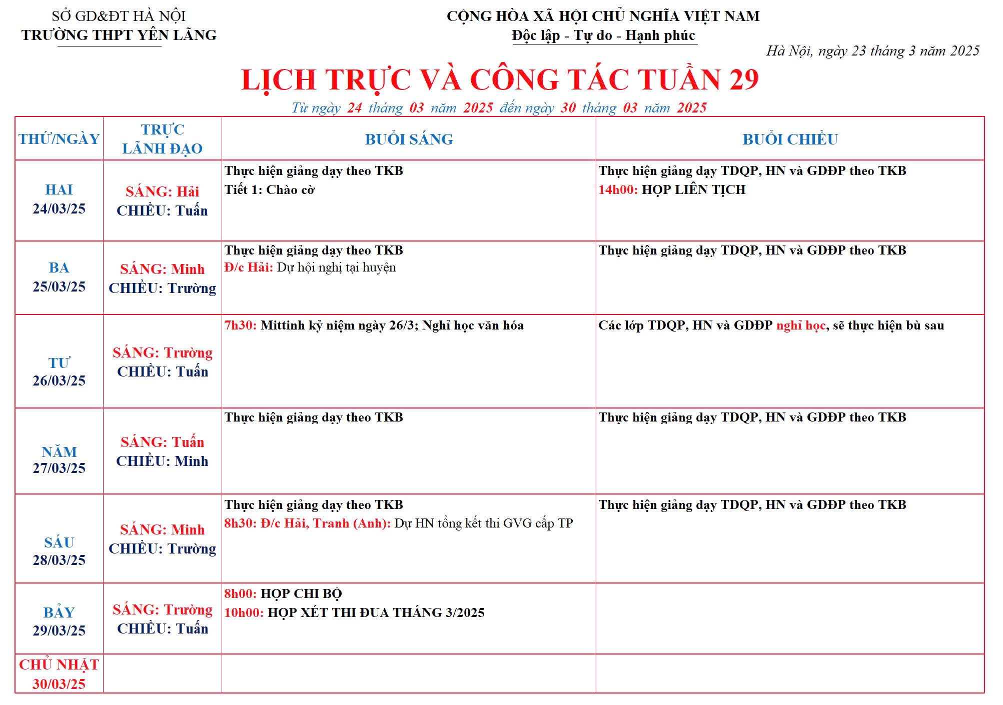Lịch công tác tuần 29 (Từ 24/3/2025-30/3/2025)