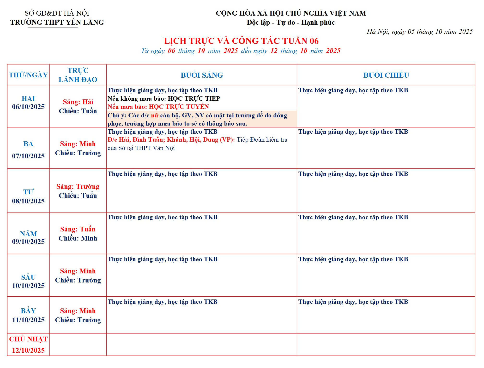 Lịch trực và công tác tuần 06 (06/10/2025-12/10/2025)