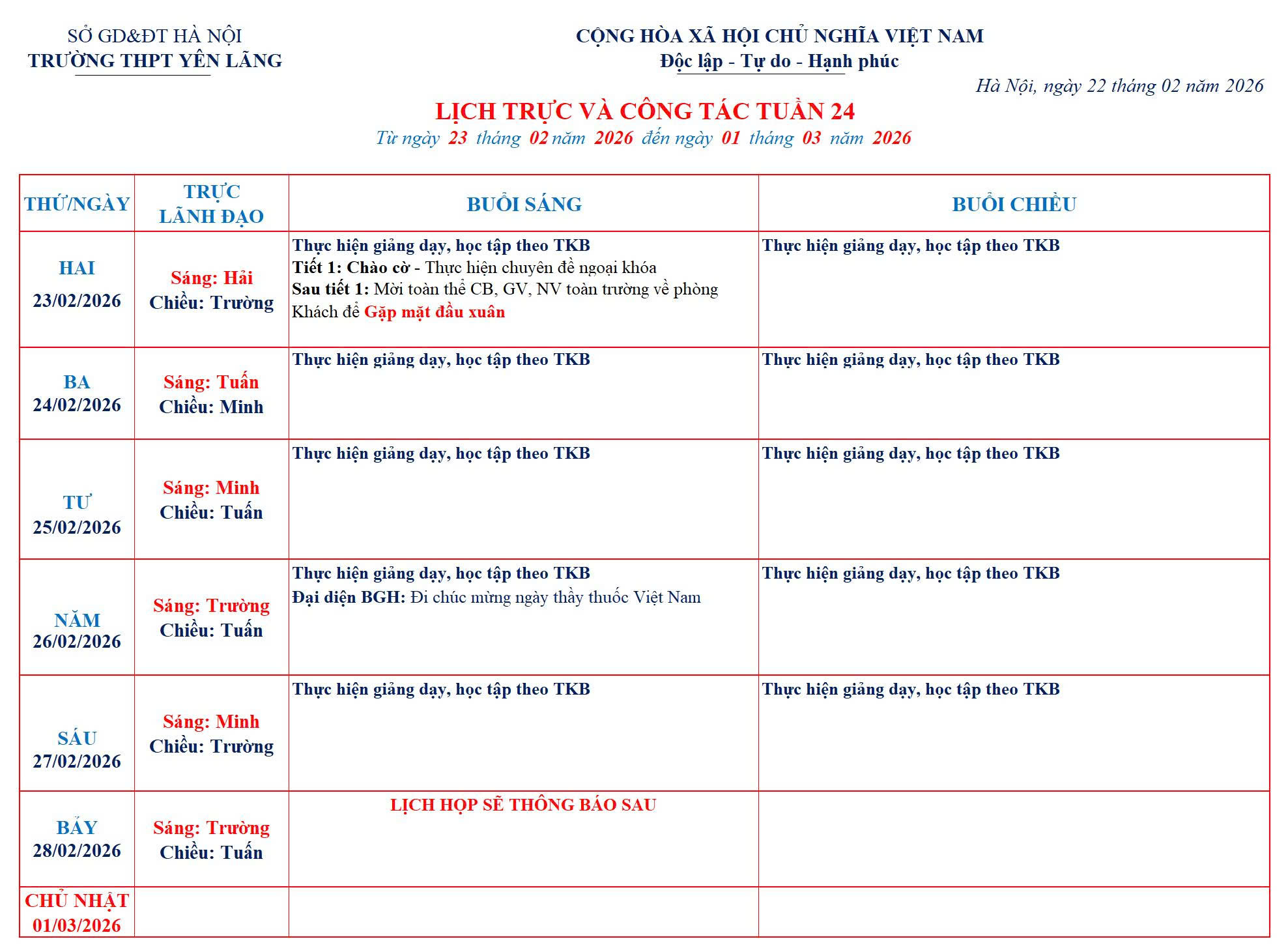 Lịch trực và công tác tuần 24 (Từ 23/2/2026 - 01/3/2026)